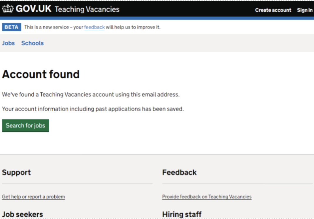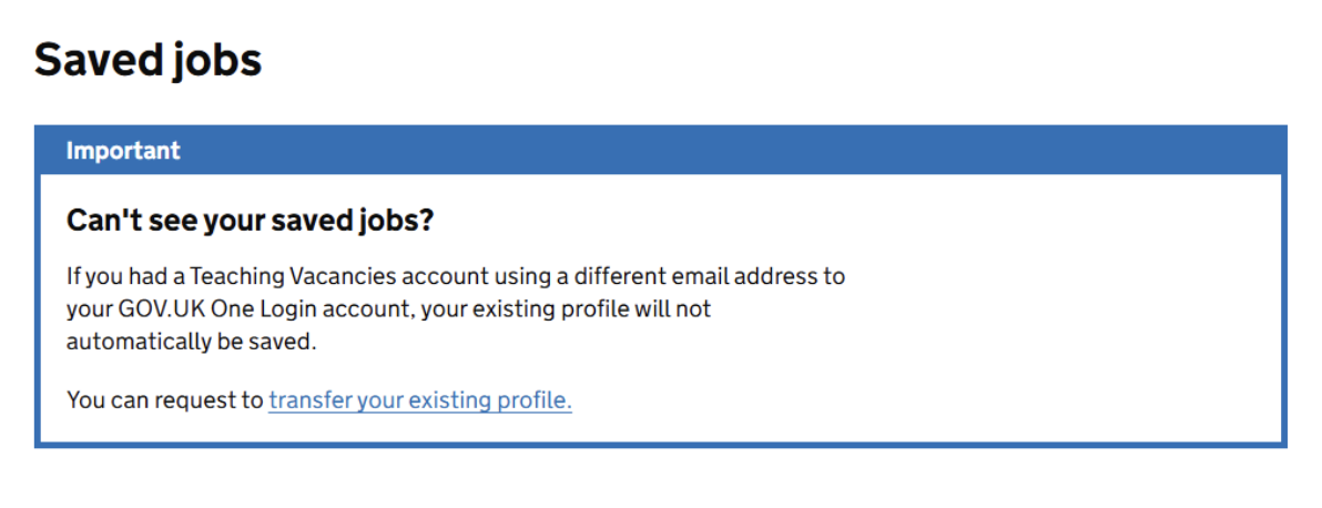 Within the Department for Education (DfE), most digital services aimed to transition over to GOV.UK One Login before the end of 2024, to join up accounts for users. The Teaching Vacancies (TV) service went live with GOV.UK One Login in November 2024 which replaced our existing jobseeker accounts. We provided an account merger process to prevent any loss of existing account information.