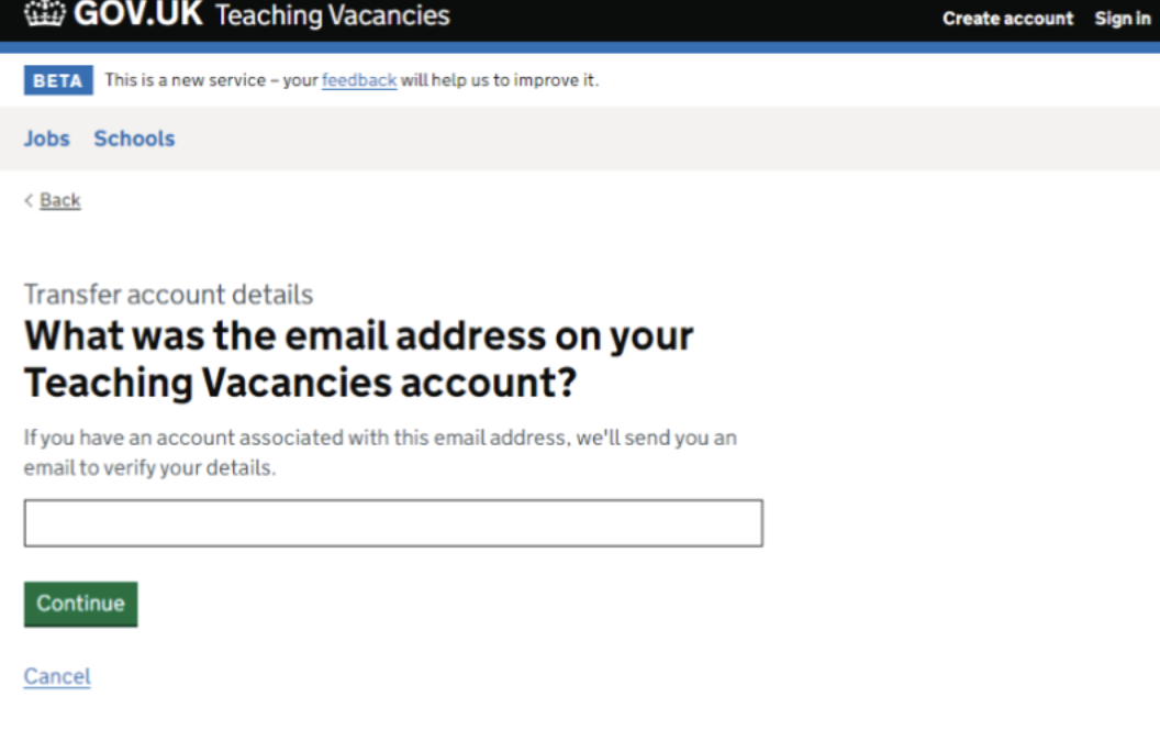 - One of the transfer account details pages asking people for the email address they used on their old Teaching Vacancies account