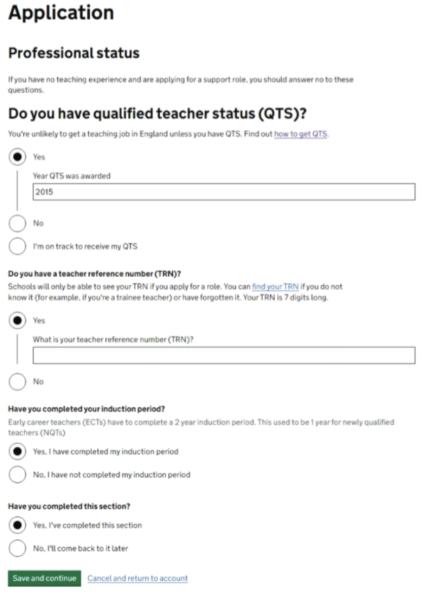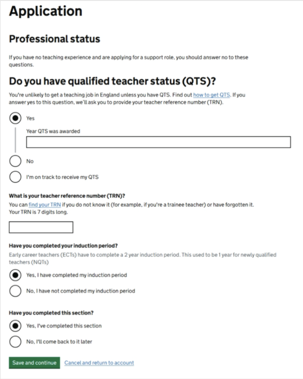 Within the professional status section of the application form and candidate profiles, we have added a TRN field. The TRN field is mandatory if the jobseeker answers ‘Yes’ to the Qualified Teacher Status (QTS) question on holding QTS. This is due to all QTS holders having a TRN. If the jobseeker answers ‘No’ or ‘I’m on track for QTS’, then the TRN field is optional.