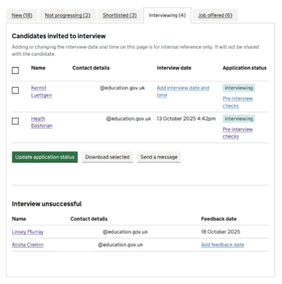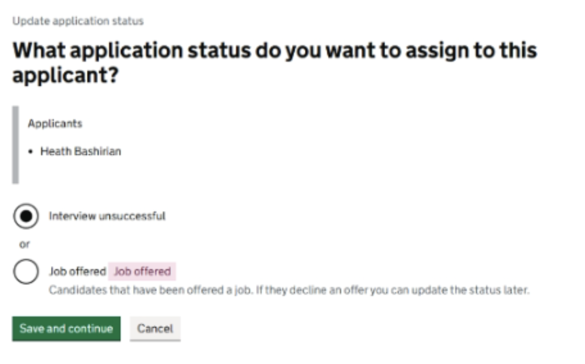 - The new ‘Interview unsuccessful’ tab – this page is accessed by selecting an applicant and then the ‘Update application status’ button
