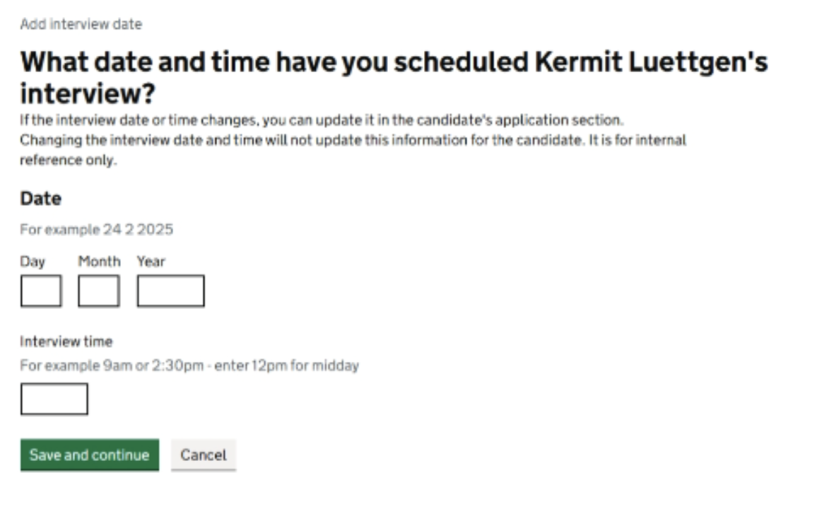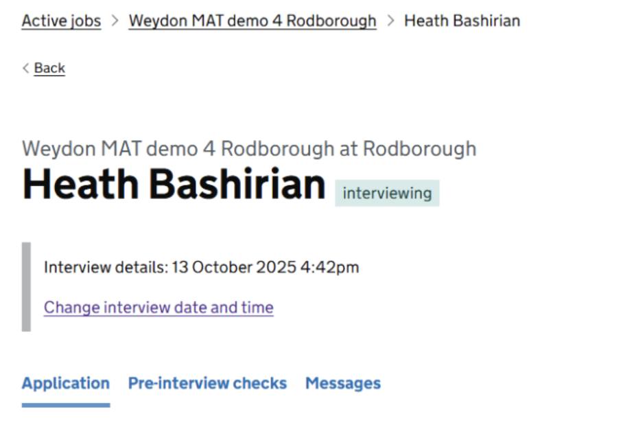 - The individual application page where the interview date and time can be viewed and updated