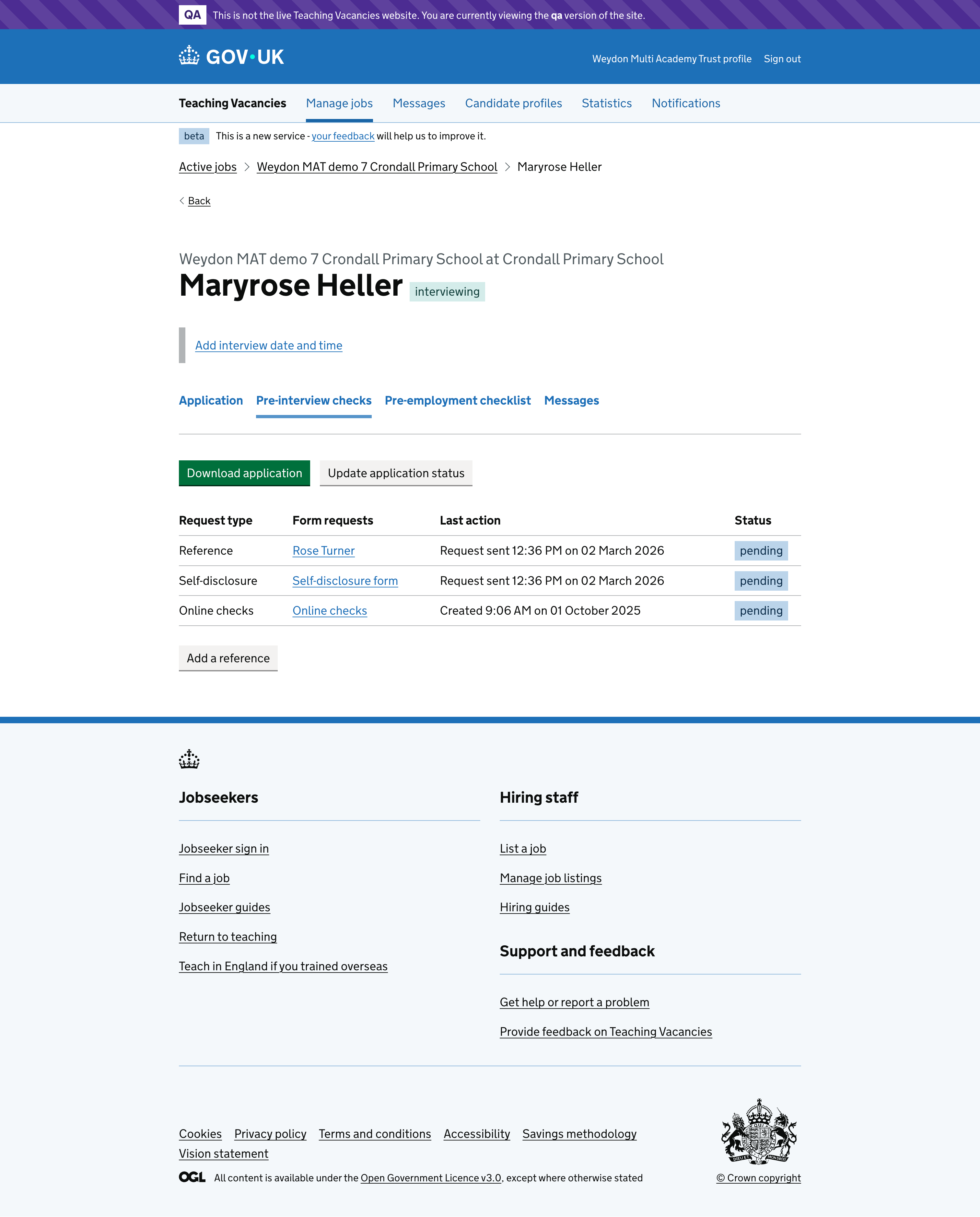 On the pre-interview checks tab, hiring staff can now manually add a reference by selecting the “Add a reference” button.