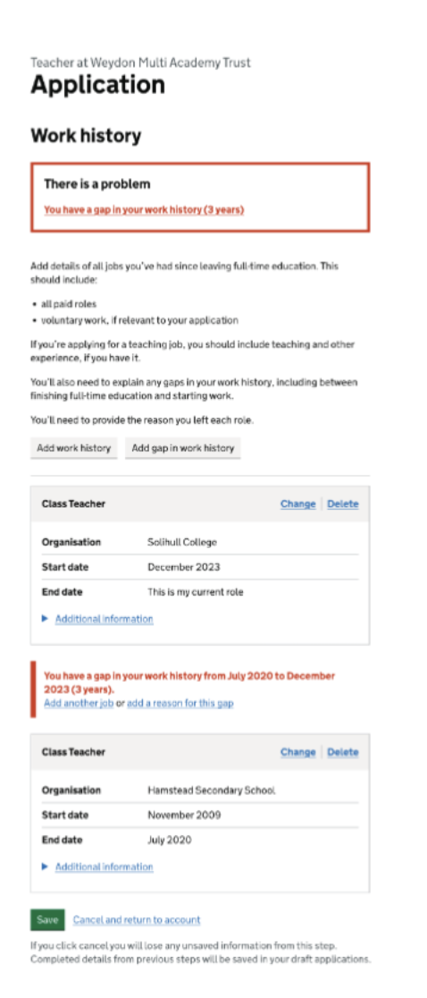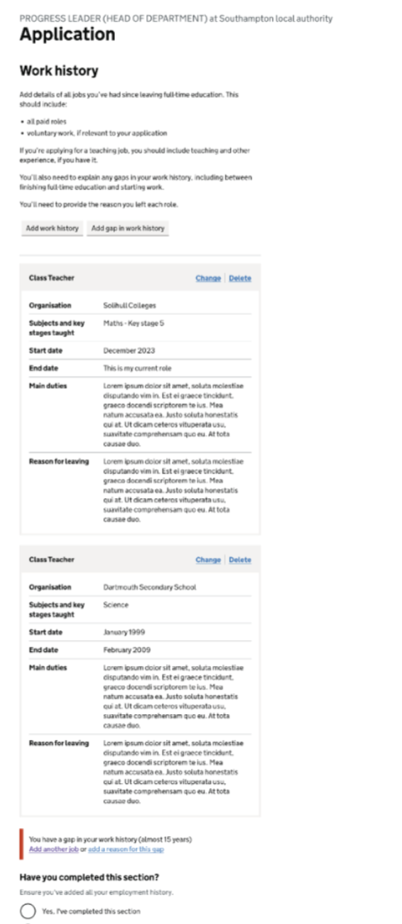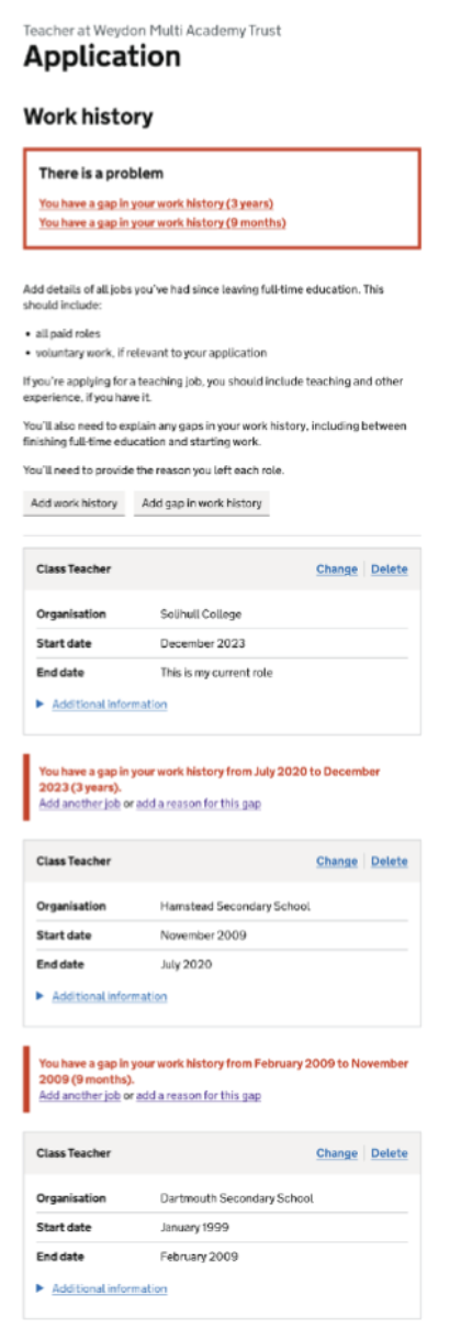 - when entering their work history, jobseekers often didn’t notice the gaps flagged by the system. When asked to go back and explain these gaps, they struggled to find the right section to complete before continuing their application.