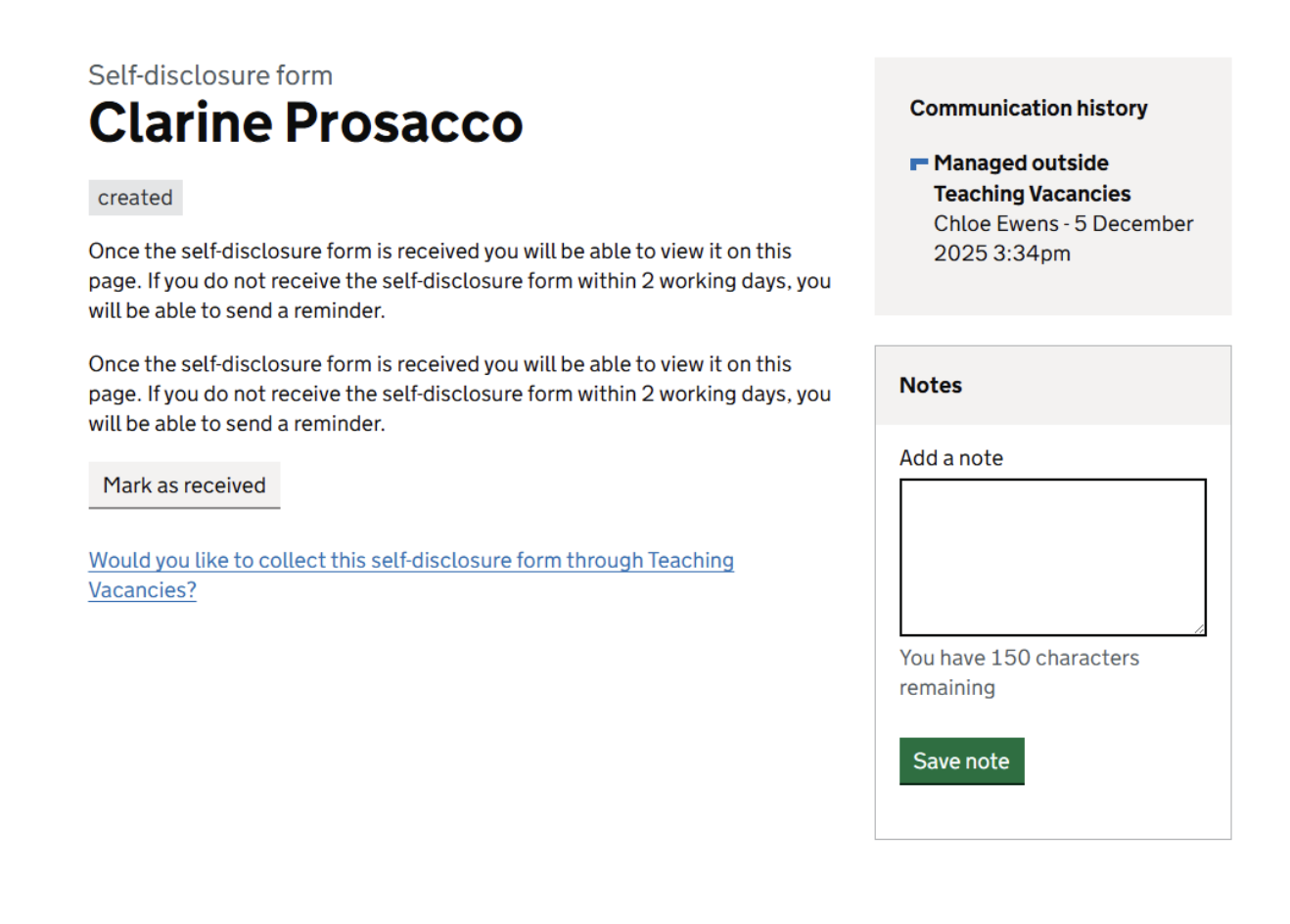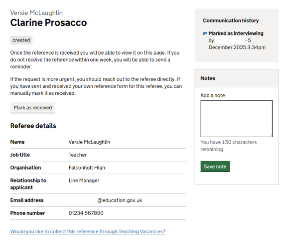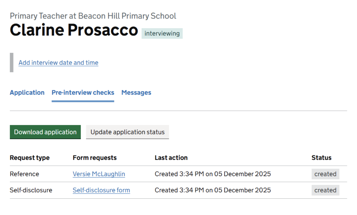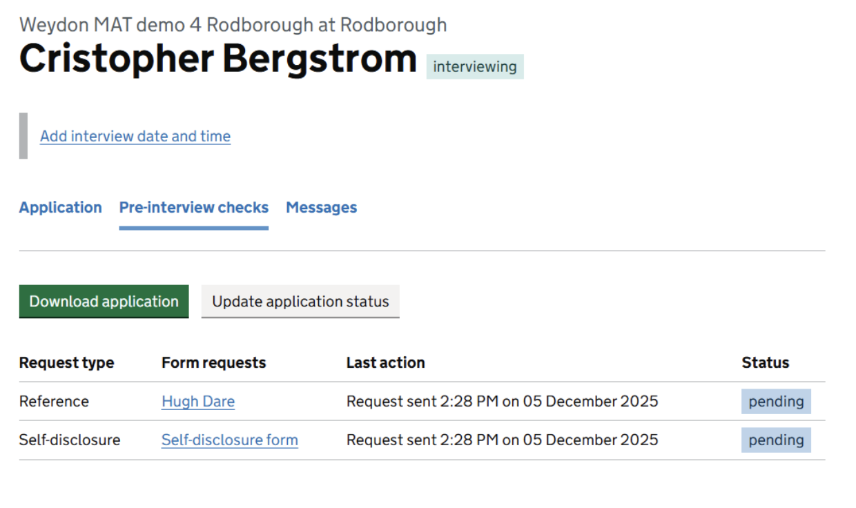 Within the existing applications management table and the ‘Interviewing’ tab, we have created a new pre-employment checks area which allows hiring staff to track, request and manage references and self-disclosure forms through Teaching Vacancies.