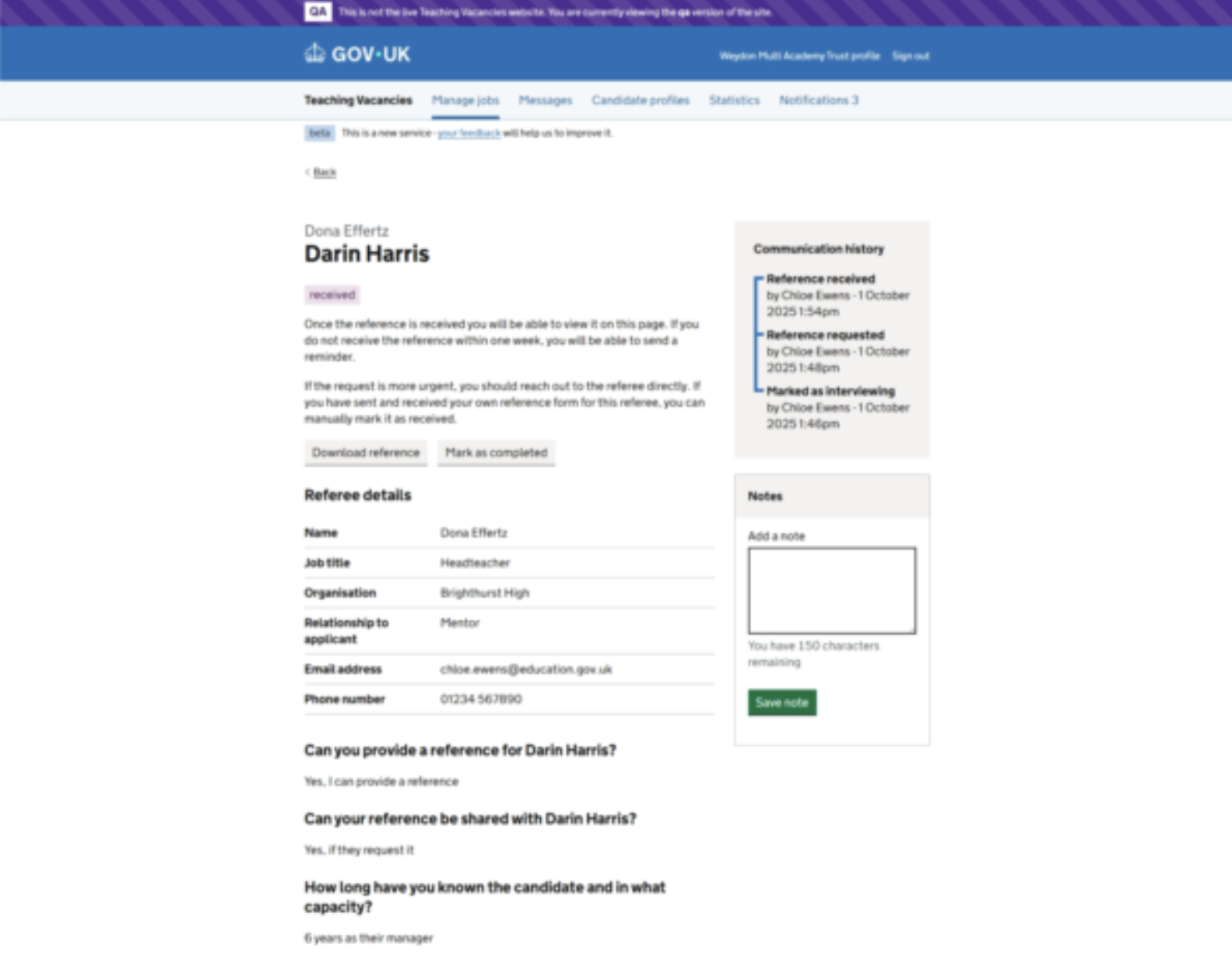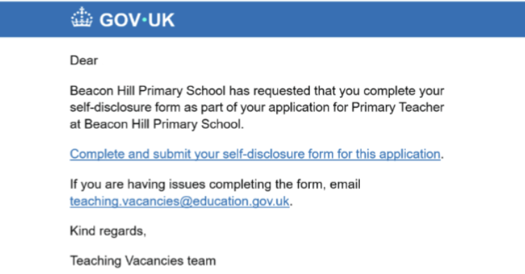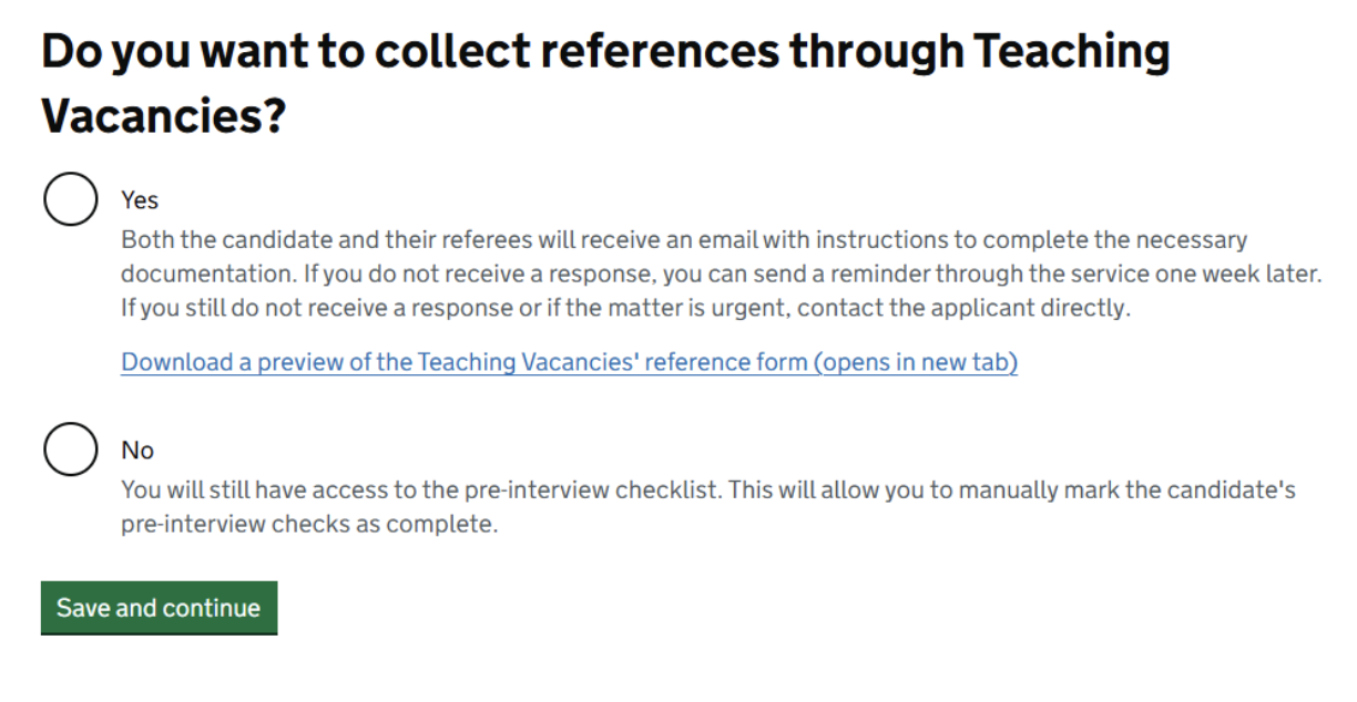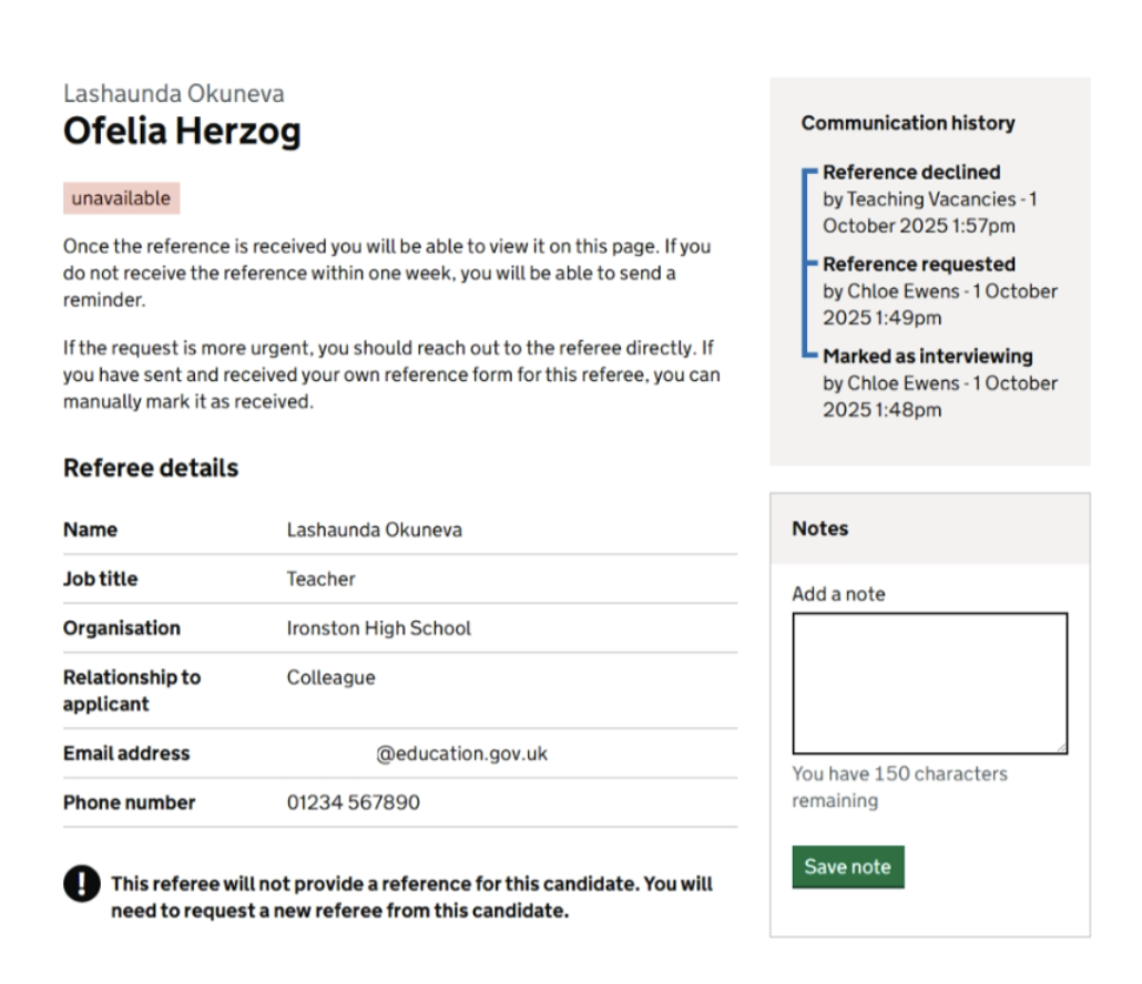 Within the existing applications management table and the ‘Interviewing’ tab, we have created a new pre-employment checks area which allows hiring staff to track, request and manage references and self-disclosure forms through Teaching Vacancies.