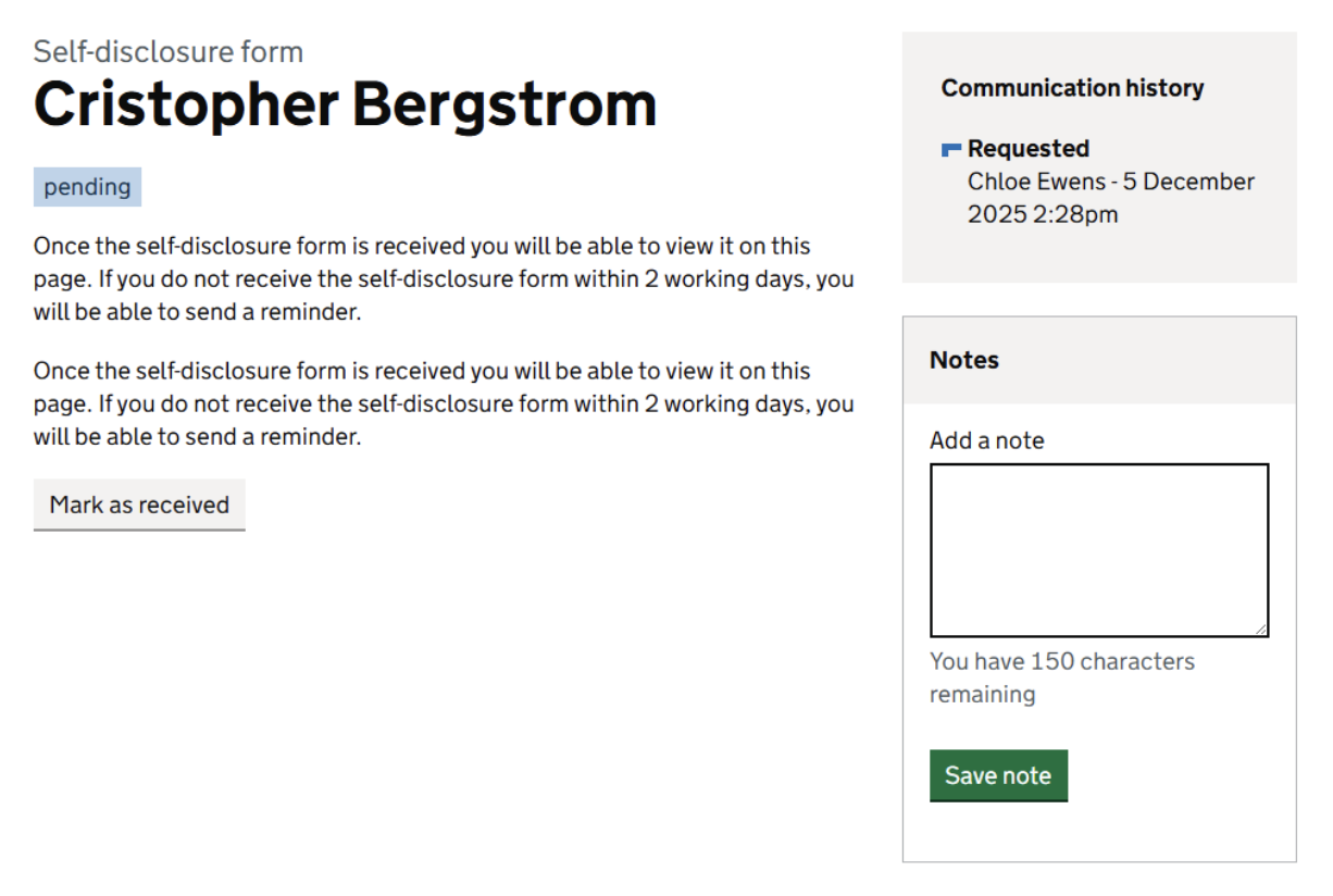 - manually mark requests as completed - if the ATS reference and self-disclosure collection process is used, we mark the requests as pending initially and mark them as received once replies are sent from referees and jobseekers so hiring staff check these and manually mark as complete