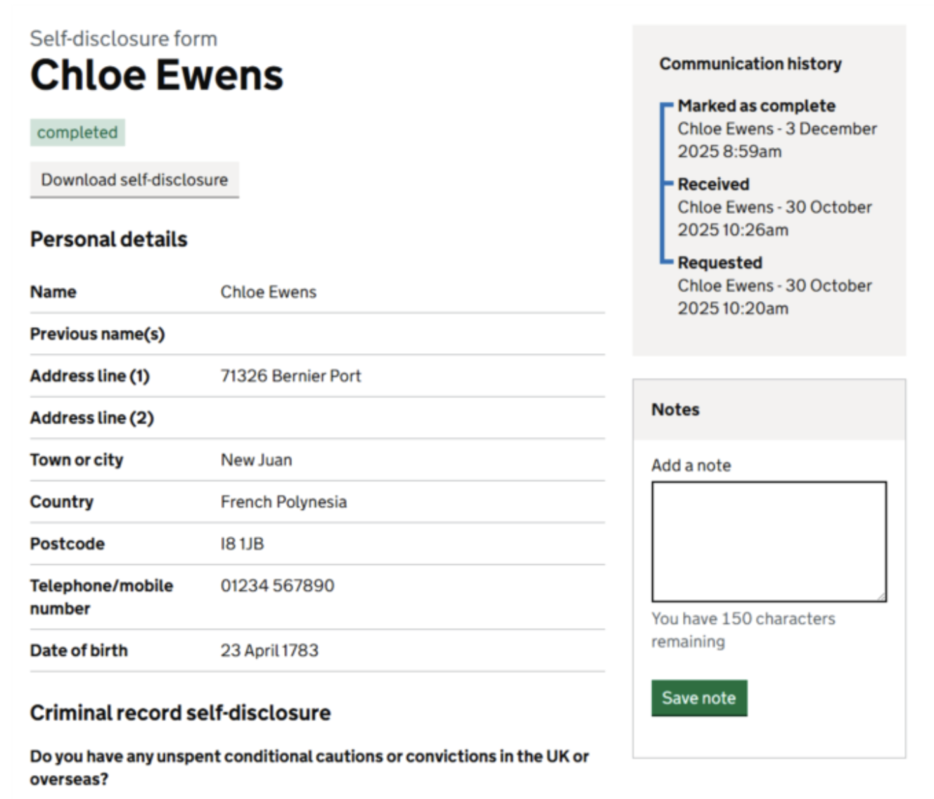 - The self-disclosure form in the completed state