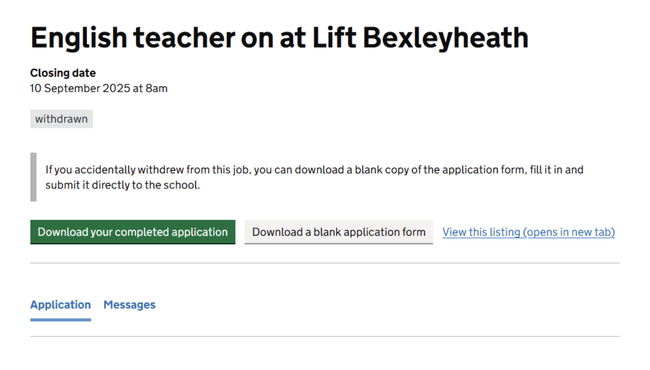 We have extended this ability to download a blank copy of the Teaching Vacancies application form to jobseekers who have withdrawn their application. If the jobseeker has withdrawn in error and still wants to apply for the role, they can now submit a handwritten application instead.