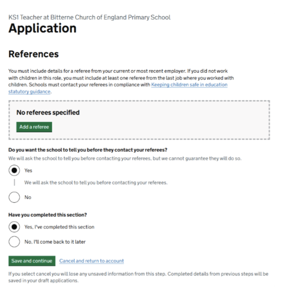 User research highlighted that jobseekers knew who to provide as their reference, but they had not always told their employer when they were seeking a new role. Jobseekers therefore wanted to provide the correct references in their application form, but to be notified if they would be moving forward to an interview so they could ensure that all the relevant parties in their current employment knew that they had applied for a new role.